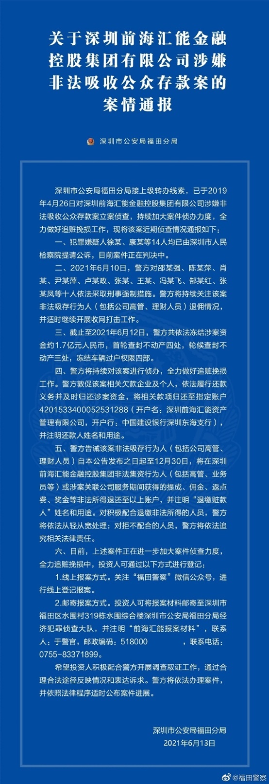 值得注意的是,深圳市公安局福田分局早已于2019年4月对前海汇能涉嫌非法吸收公众存款案立案侦察。