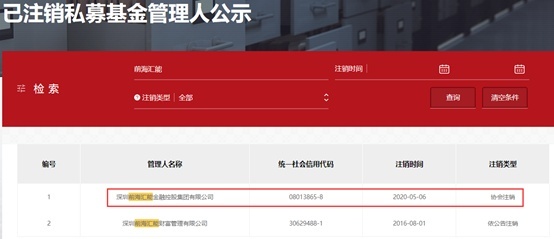 中国证券投资基金业协会的资料显示,深圳前海汇能金融控股集团有限公司此前为私募基金管理人,但已于2020年5月6日被协会注销。