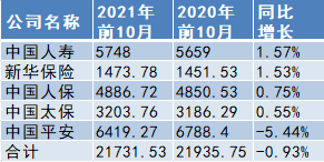 前五大上市a股保险公司前十个月原保费收入2.17万亿元 同比微降0.93%