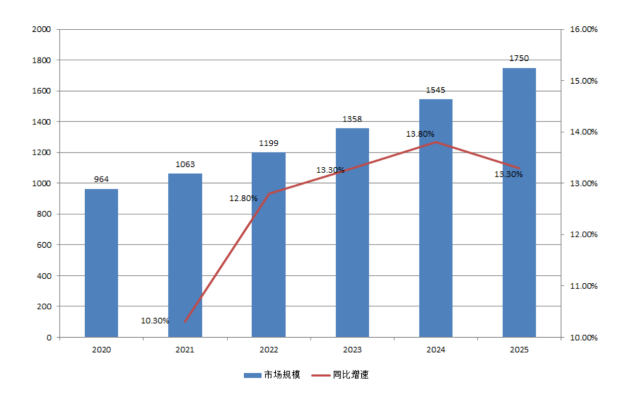 2020-2025年中国光通信市场规模及增速预测变化(单位亿元,%)