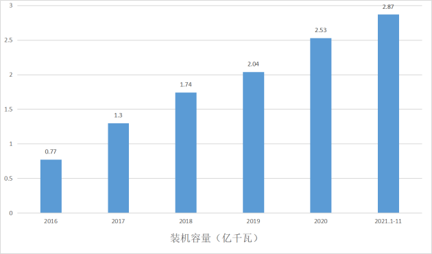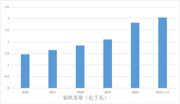 国家能源局发布的2021年1-11月份全国电力工业统计数据。截至11月底,风电装机容量约3.05亿千瓦,同比增长29%;太阳能发电装机容量约2.9亿千瓦,同比增长24.1%;核电装机5326万千瓦,同比增长6.8%。
