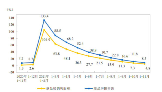 2021年1—11月份,商品房销售面积158131万平方米,同比增长4.8%;比2019年1—11月份增长6.2%,两年平均增长3.1%。商品房销售额161667亿元,增长8.5%;比2019年1—11月份增长16.3%,两年平均增长7.8%。
