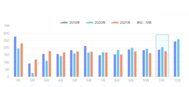 2021年1-11月,乘用车产销分别完成1887.9万辆和1906.0万辆,同比分别增长6.9%和7.1%。其中,1-11月新能源乘用车批发280.7万辆,同比增长191%。2021年1-11月,商用车产销分别完成429.3万辆和442.9万辆,同比分别下降9.1%和5.3%。