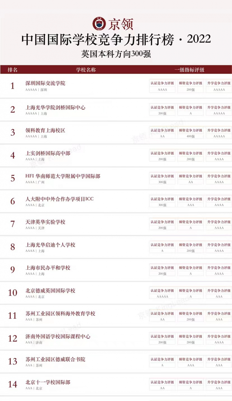 近日,“2022中国国际学校竞争力排行榜”由京领正式发布,据悉,这是京领连续第四年发布中国国际学校系列榜单。由于美国本科与英国本科在学生录取评估上存在差异,“中国国际学校竞争力排行榜”分为美国本科方向榜单和英国本科方向榜单。
