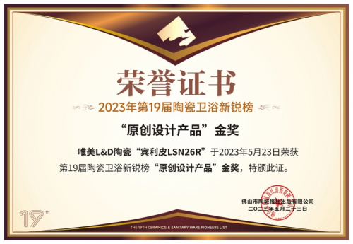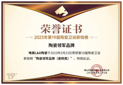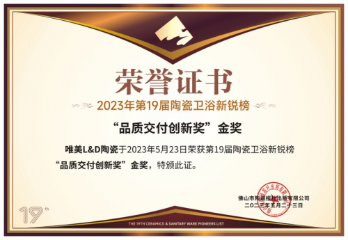 第19届新锐榜吸引了200多家企业参与角逐,非凡盛况,竞争激烈。唯美L&D陶瓷在超200家企业和品牌的竞逐中脱颖而出,揽获“陶瓷领军品牌”、“原创设计产品”金奖以及“品质交付创新奖” 金奖三项重量级大奖。