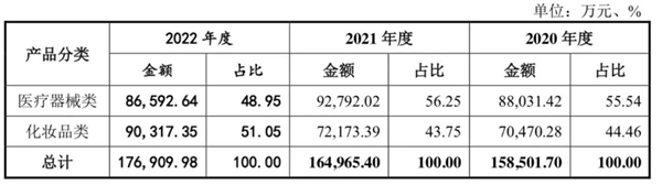 依托多类产品,敷尔佳业绩一路高增。据招股书披露,2020-2022年,敷尔佳营收分别为15.85亿元、16.50亿元和17.69亿元。其中,医疗器械类产品收入分别为 8.8亿元、9.27亿元及 8.65亿元,化妆品类产品收入分别为 7.04亿元、7.21亿元及 9.03亿元。至2022年,化妆品类功能性护肤品的销售收入已占51.05%。