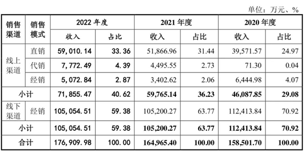 招股书显示,报告期内,公司线上收入分别为 4.60亿元、5.97亿元及 7.18亿元,占收入的比重为 29.08%、36.23%及40.62%;线下,公司经销收入分别为 11.24亿元、10.52亿元 及 10.50亿元,占当期营业收入的比重分别为70.92%、63.77%及 59.38%。
