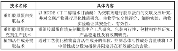 基于这些科研积淀,敷尔佳已取得多项技术成果,如重组胶原蛋白交联技术、重组胶原蛋白填充剂生产技术和植物活性成分提取技术等。