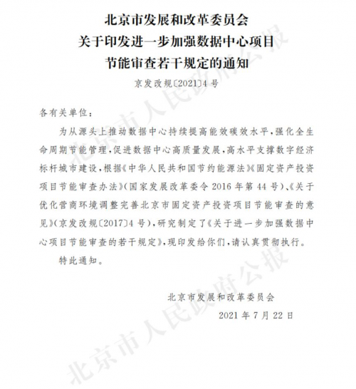 8月4日,北京发改委最新修订的《关于进一步加强数据中心项目节能审查若干规定》正式施行。