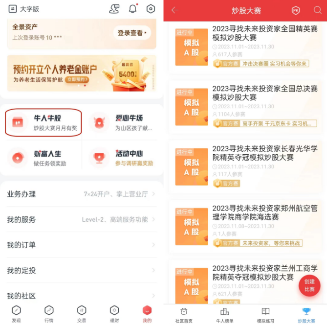 “寻找未来投资家”活动依托君弘APP平台特色投教社区-牛人牛股开展,为学生投资理财的操作和技巧演练提供平台,向学生传递投资理念的同时,引导学生学以致用,提升专业技能。活动开设投教知识竞赛、模拟投资比赛、K线对决投教游戏3种方式,助力大学生群体通过理论与实践结合的方式领会科学投资方法,提升金融素养和金融能力。