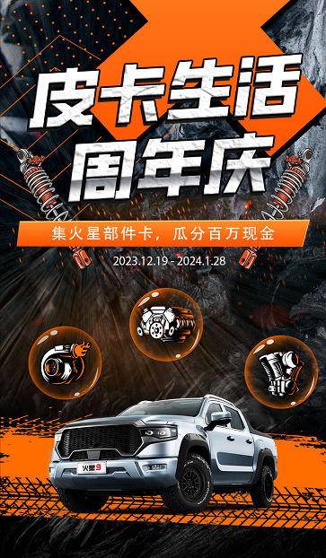 享受皮卡生活从此刻开启,还在等什么?年末福利大放送,火星皮卡旗下皮卡生活APP周年庆即将来袭,快来参与活动,集齐火星部件卡,即刻瓜分百万现金!